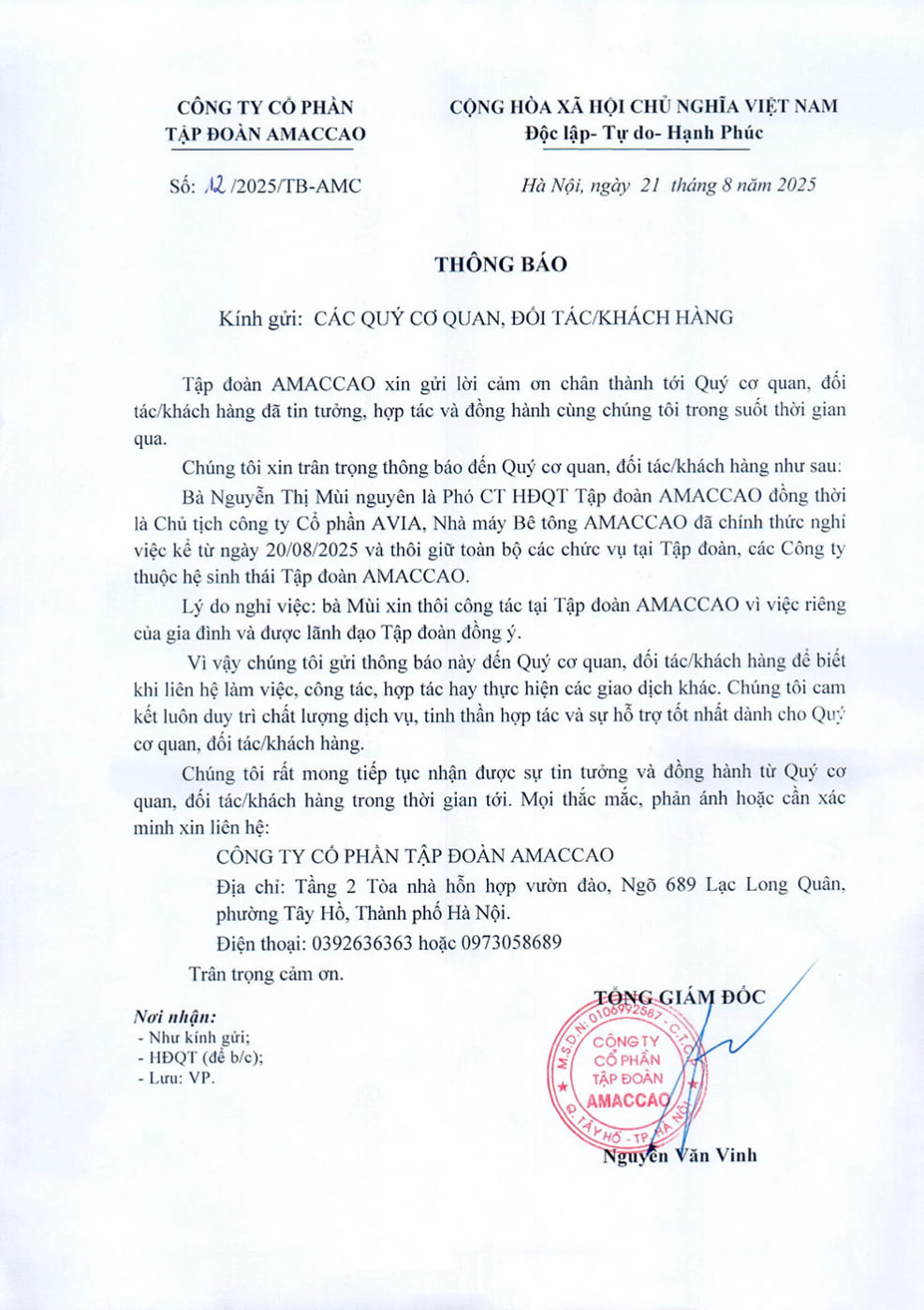 Bà Nguyễn Thị Mùi nguyên là Phó CT HĐQT Tập đoàn AMACCAO đồng thời là Chủ tịch công ty Cổ phần AVIA, Nhà máy bê tông AMACCAO đã chính thức nghỉ việc kể từ ngày 20/08/2025 và thôi giữ toàn bộ các chức vụ tại Tập đoàn, các Công ty thuộc hệ sinh thái Tập đoàn AMACCAO.